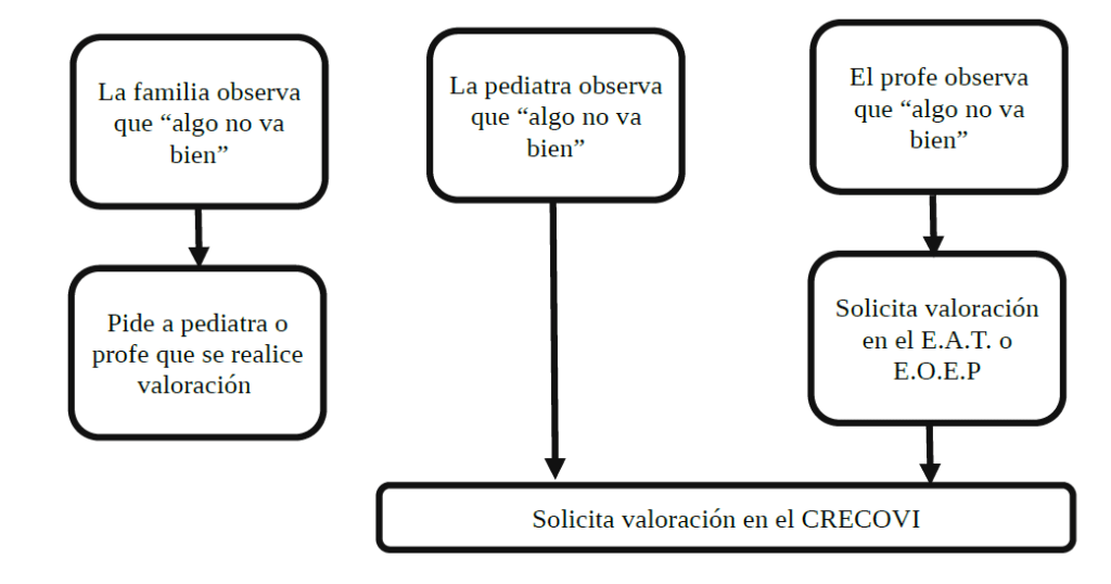 Empecemos por el principio. Las primeras señales de necesidad de atención pueden ser observadas por la familia, la pediatra, el profesor… En el caso de los menores de 6 años, la valoración de esta necesidad y la derivación a los recursos de atención, corresponde al CRECOVI- Centro Regional de Coordinación y Valoración Infantil. Podéis consultar más sobre este recurso aquí: https://www.comunidad.madrid/centros/centro-regional-coordinacion-valoracion-infantil-crecovi.