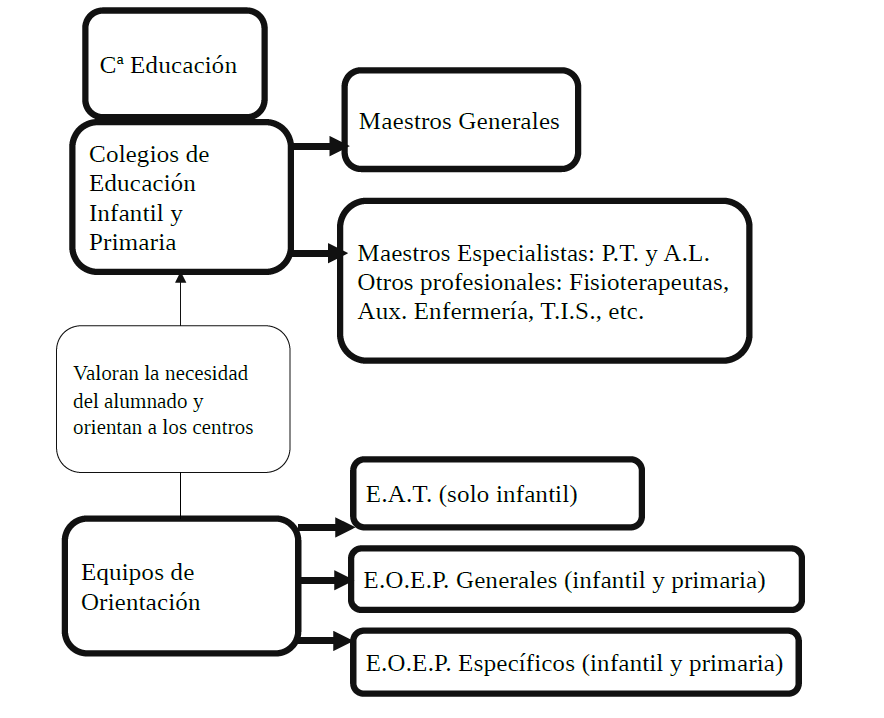 Cada centro educativo tiene asignado un Equipo de Atención Temprana (E.A.T.) o Equipo de Orientación Educativa y Psicopedagógica (E.O.E.P.). Los E.A.T. atienden solo a alumnado que está escolarizado en Educación Infantil, mientras que los E.O.E.P. atienden tanto a Infantil como a Primaria.