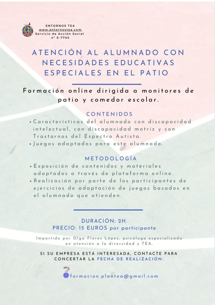 La formación ofertada incluye una descripción de las necesidades que este alumnado presenta habitualmente, la presentación de materiales y adaptaciones de juego, así como la propia elaboración por parte de los participantes de alguna adaptación, para consolidar los contenidos expuestos.